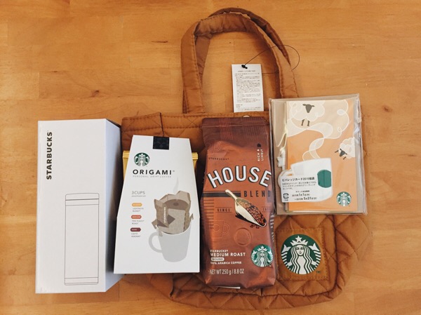 中はステンレスボトル、ORIGAMI3P、ハウスブレンド粉、ビバレッジカード4枚、トートバッグ