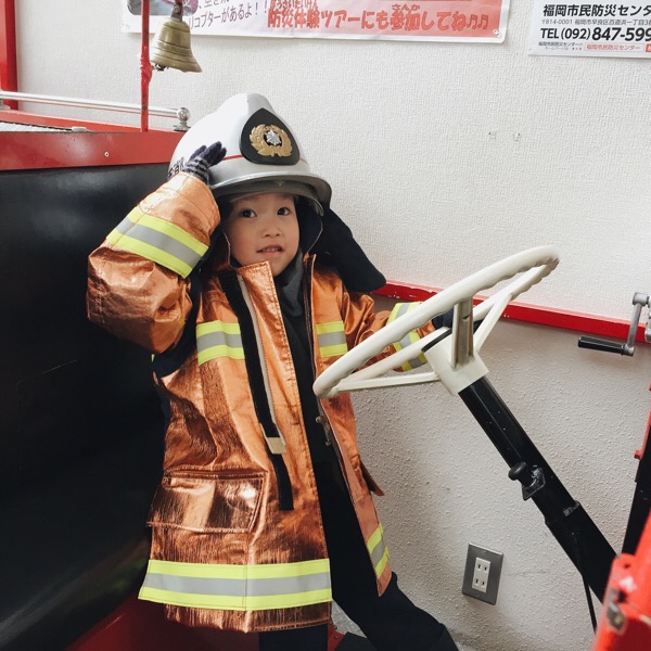 ミニ消防車に並んで乗って、消防服着て記念撮影。